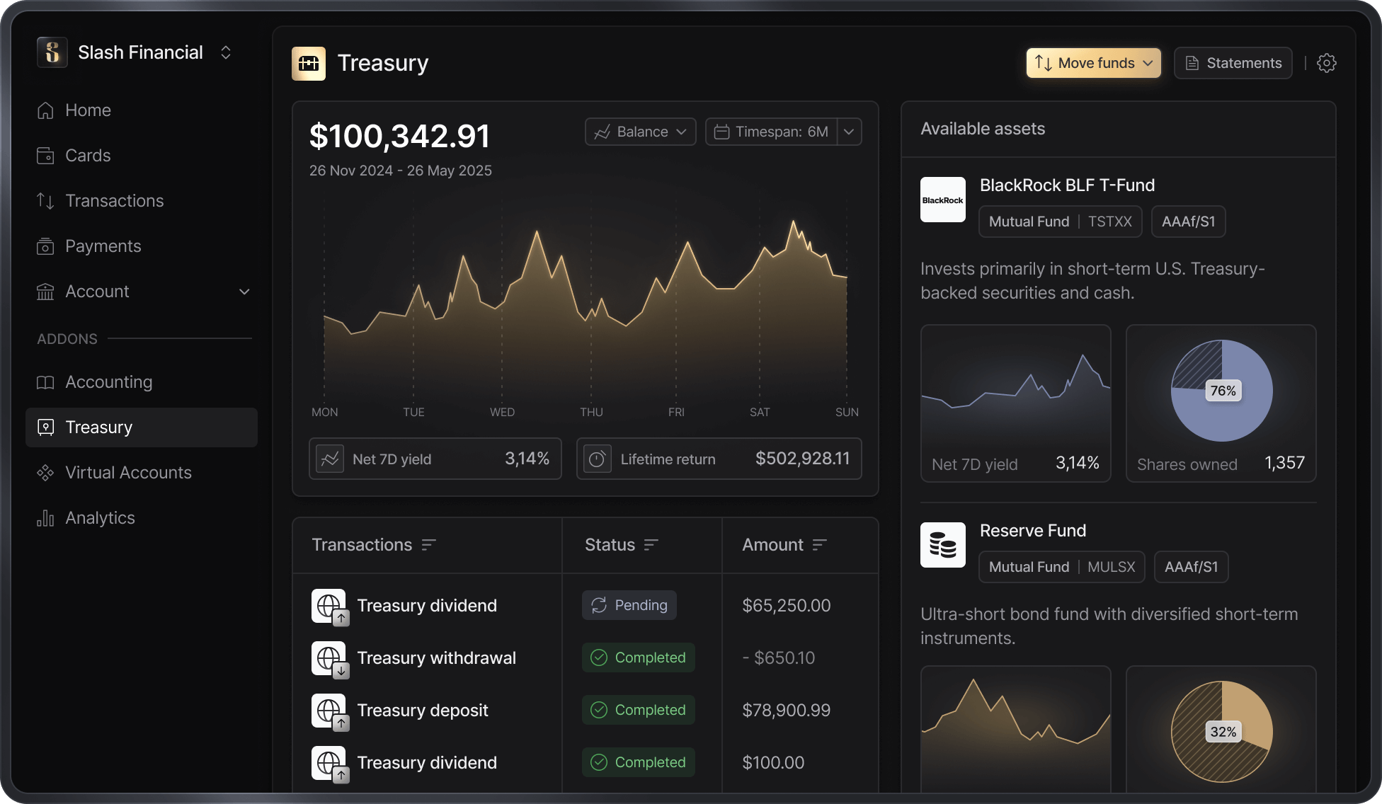 Earn a 3.97%6 annualized yield with minimal markups, all within your Slash account with an extremely intuitive interface.