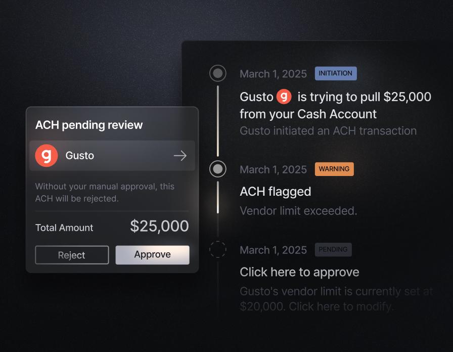 Comprehensive ACH authorization controls let you manage and verify every transaction. Approve, block, or limit transfers with granular precision.