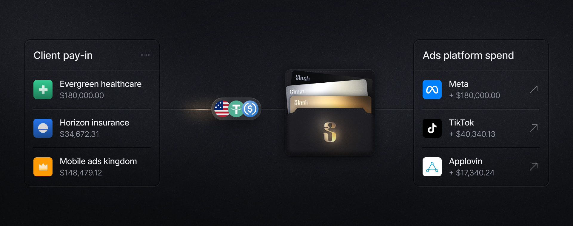 Leverage Slash’s complete finance platform and access high cashback, power APIs, crypto deposits, and AR management for your ads spend.