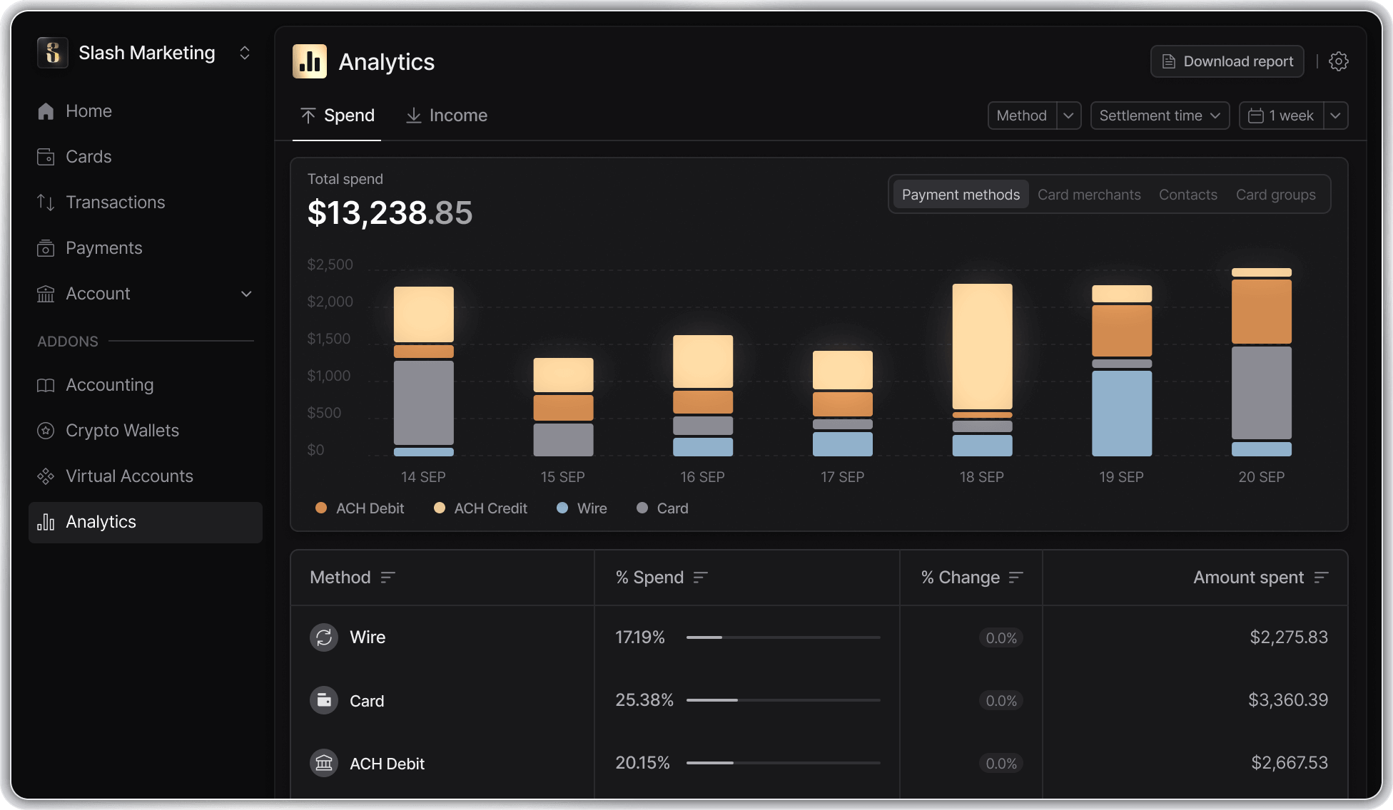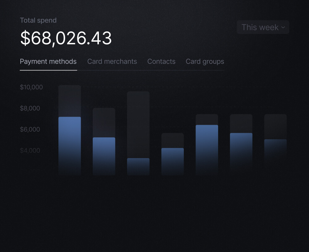 Payment methods. Filter your spend by ACH, wire, or card payments