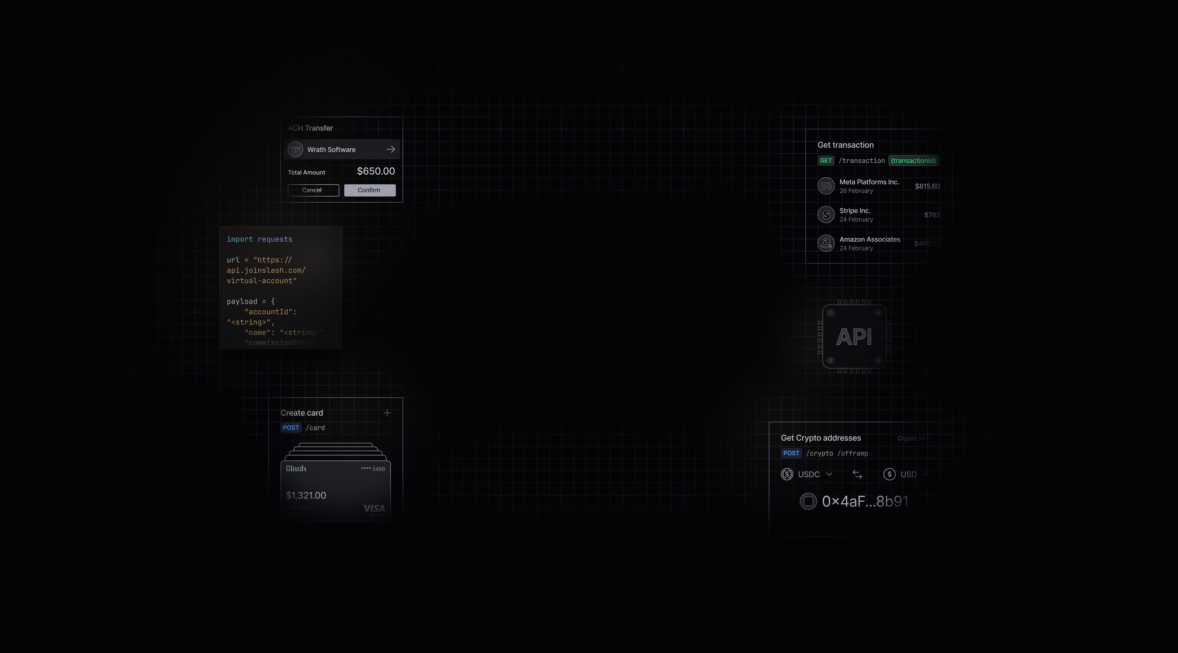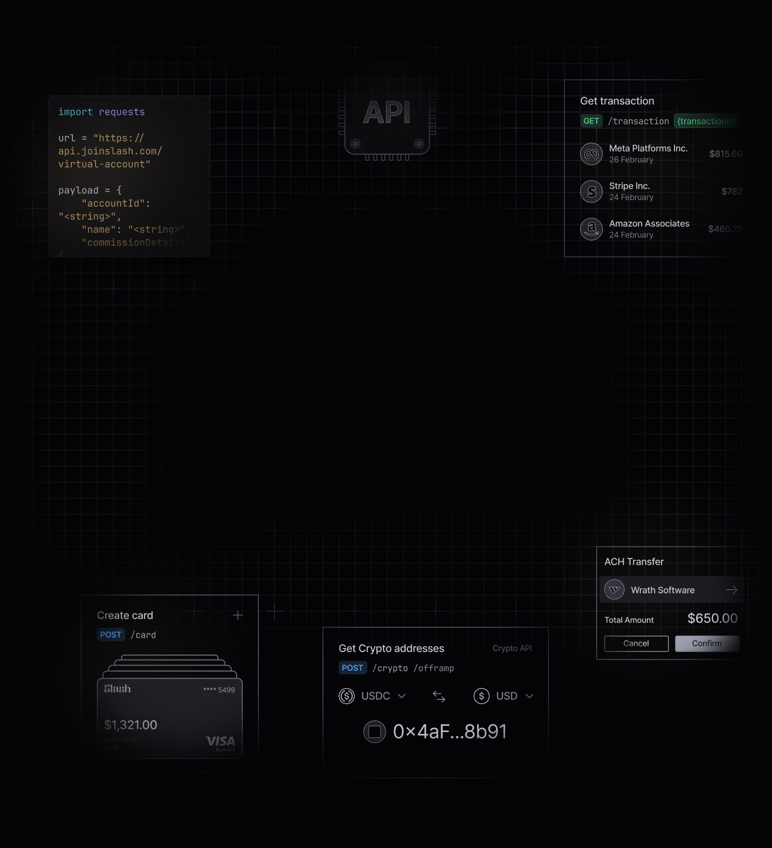 Integrate Slash into your stack in minutes. Automate transfers, reconcile payouts, and access real-time financial data with a single API.