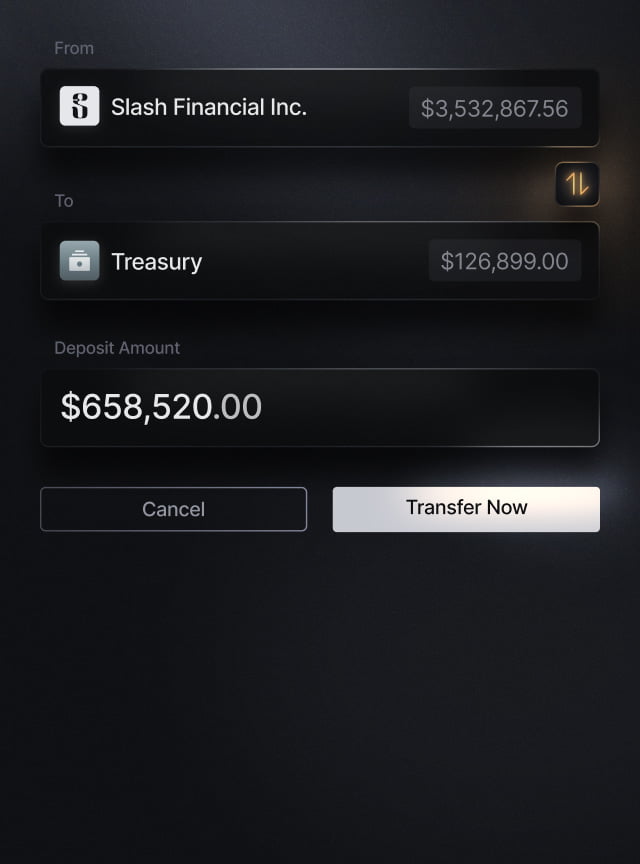 Move funds in and out of Treasury quickly from your Slash dashboard. No separate logins, ACH delays, or learning curves.