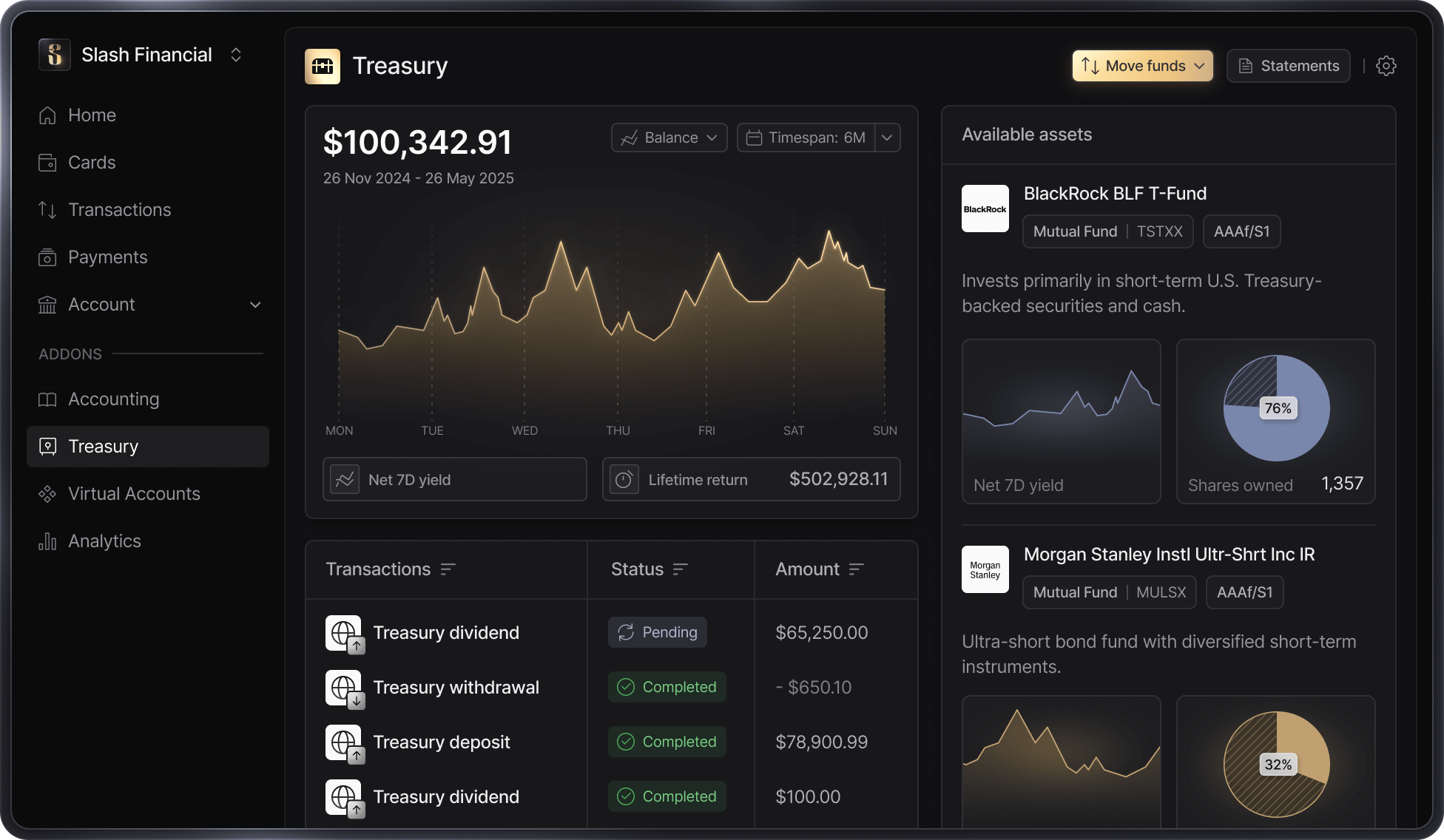 Earn a 3.91%6 annualized yield with minimal markups, all within your Slash account with an extremely intuitive interface.